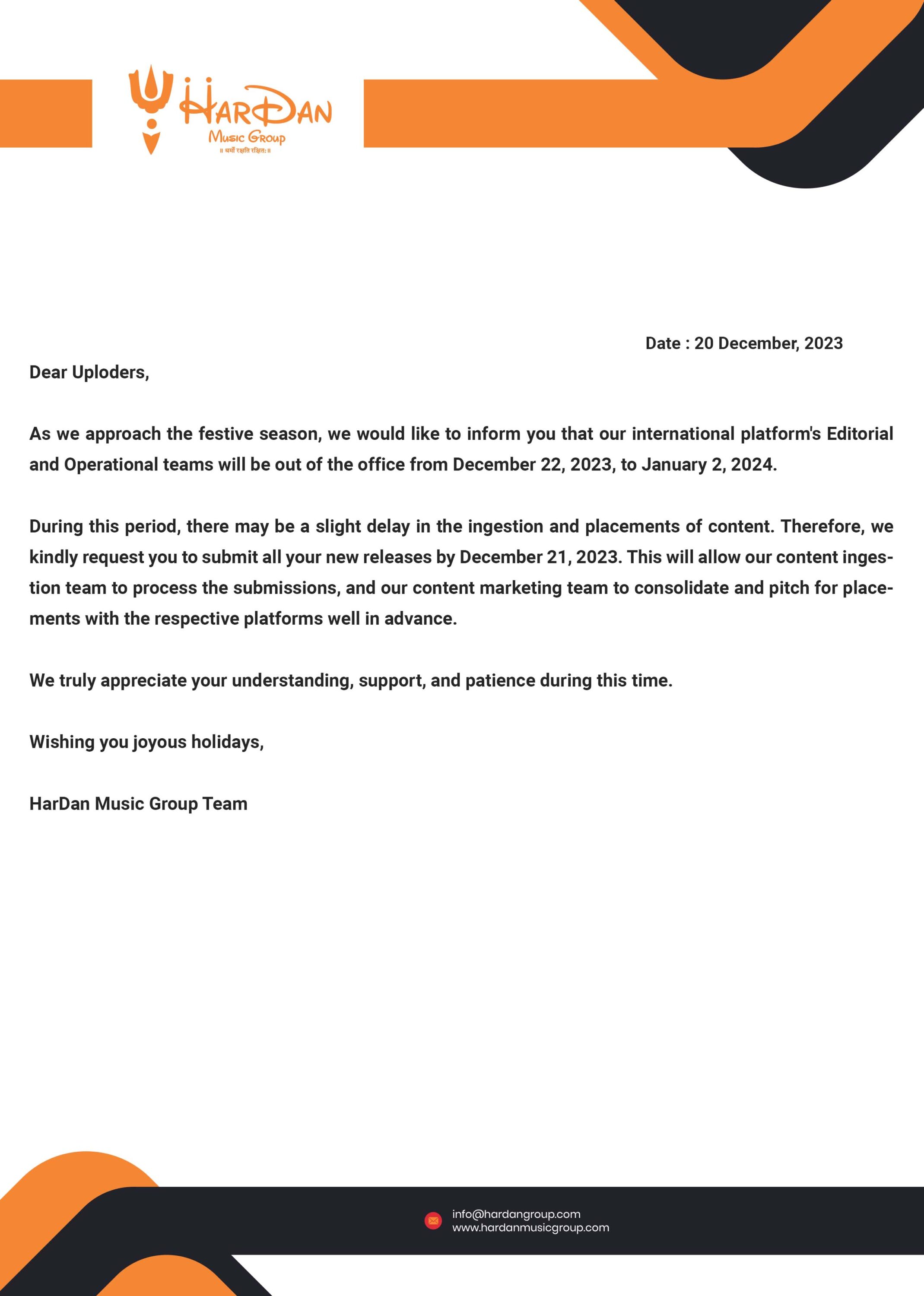 During this period, there may be a slight delay in the ingestion and placement of content. Therefore, we kindly request you submit all your new releases by December 21, 2023. This will allow our content ingestion team to process the submissions, and our content marketing team to consolidate and pitch for placements with the respective platforms well in advance.